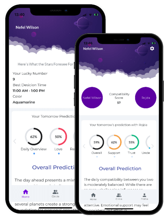 Add up to 30 circles (friends, family, partners) for compatibility & shared outlooks.